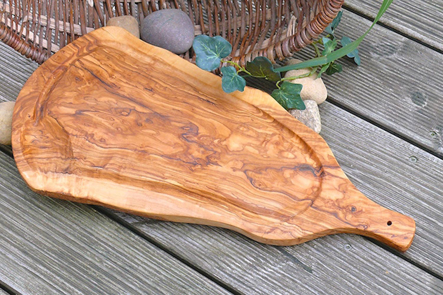 A massive carving board with handle and surrounding juice rim. The back of the board has no groove and can therefore also be used as a serving board or normal cutting board at the same time.